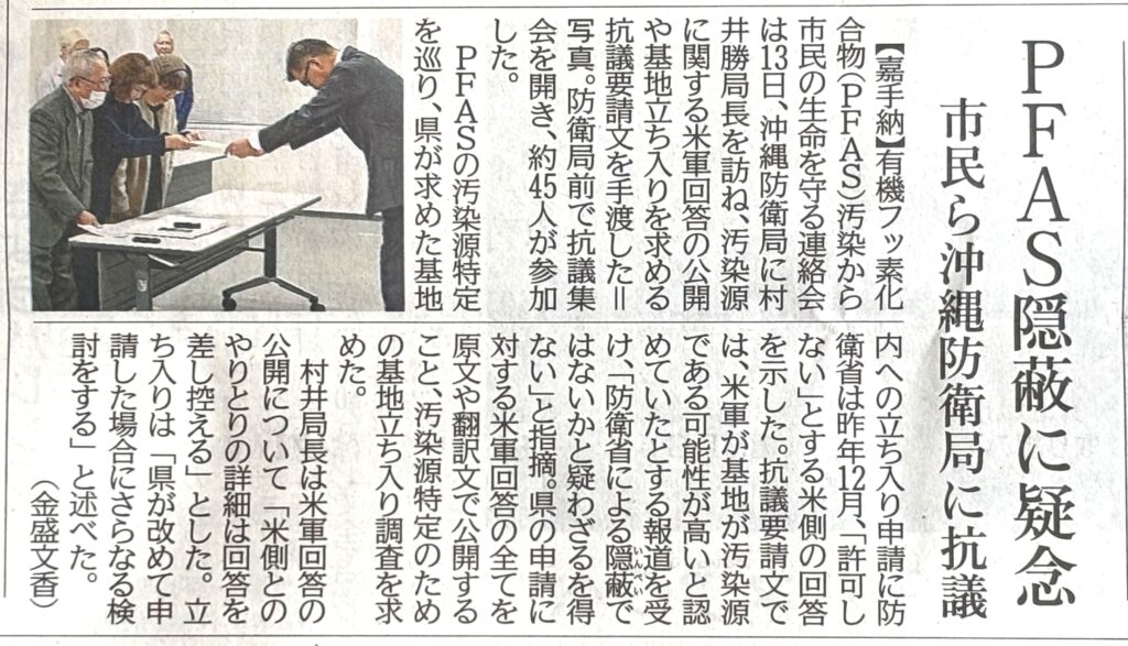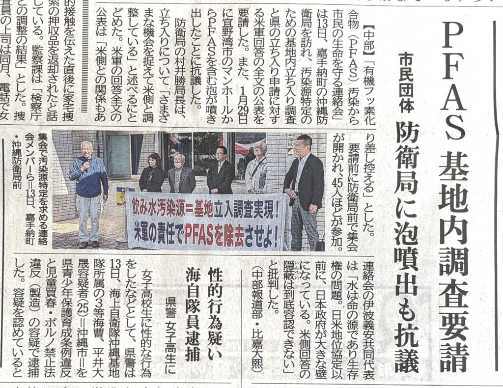 投稿日: 2026年2月14日2026年2月14日 投稿者: waterS防衛の「米基地内汚染」隠蔽と泡噴出で基地立入要請 2/13 ・沖縄におけるPFAS汚染源特定のため、政府防衛省はこれまでの沖縄県による立入り申請に対する米軍回答(原本の写し)の全てを原文及び翻訳文で公開すること。・汚染源特定のために国は沖縄県や地元自治体とともに基地立入り調査を実施すること。 2026年2月14日『琉球新報』 2026年2月14日『沖縄タイムス』 ▽シェアする▽
